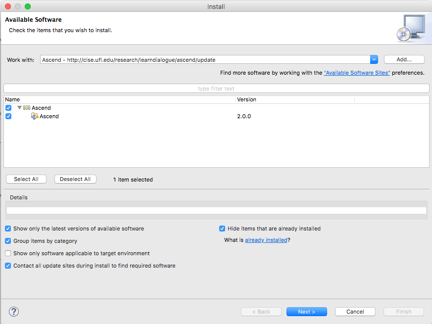 Installing AscendInstall Ascend after having installed and opened Eclipse