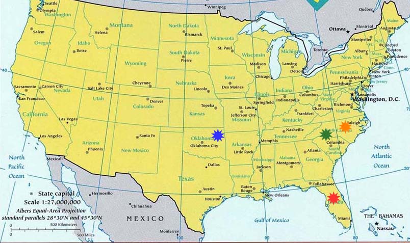 University of Tulsa. 1997 - 2002: I moved to Chapel Hill, NC (yellow) - the southern part of Heaven - to go to grad school. I fell in love with the triangle area and hope to move back there sometime in my life. If you get a chance, you should go visit. It is awesome. 2002 - 2003: I moved to Charlotte, NC (green) to do my postdoc at UNC-Charlotte. I didn't have much time there, though it was 'okay'. It is much more a southern city than Raleigh. 2003 - present: I moved to Gainesville, FL (red) in August 2003 to start my first 'real job'. I like it so far, except there is no ice rink... ugh. Nice people, small-er town. |