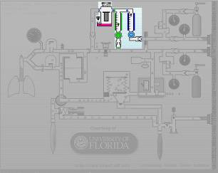 The major visible and invisible components of a real anesthesia machine are represented in the VAM with animated 2D icons. For example, invisible gas flow is represented by color-coded particles (i.e. green particles are O2; blue particles are N2O). Students interact with the components by clicking on the icons with a mouse. For example, users can click on the O2 knob and then drag the mouse to turn the knob. This interaction increases the simulated flow of O2, which is visualized by an increase the speed of the green O2 particles.