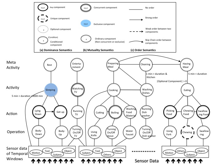 To achieve this goal, we develop a Semantic-Based Generic Activity Model (SGAM), which utilizes simple yet often ignored activity semantics. Activity semantics are highly evidential knowledge that can identify an activity more accurately in ambiguous or “noisy” situations. To exploit semantics, we first define eight (8) primitive activity components: subject, time, location, motive, tool, motion, object, and context. Existing activity models utilize only four primitive components. We adopt a generic activity framework, based on our eight primitive components that is a refined hierarchical composition structure of five layers including sensor, operation, action, activity, and meta-activity. Our SGAM model contains detailed activity semantic knowledge, such as the specific role of an activity component, and constraint or relationship with other components. We classify semantics into four types, such as dominance semantics, mutuality semantics, order semantics, and activity effect semantics. A summary of our SGAM model semantics and example models of selected activities of daily living are shown in the figure below.