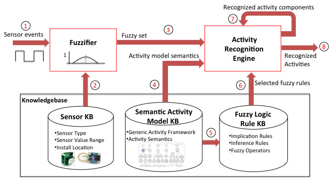 Our Semantic-Based Generic Activity Model (SGAM) has been shown to be capable of representing human activity more accurately than currently known models in the literature. The added semantic specificity increases accuracy in terms of reducing false recognitions (false positives). To address the other side of accuracy, in which false negatives should also be reduced, we must address the issue of variability of the human activity. To address variability, the activity recognition algorithm should be able to tolerate a certain amount of uncertainty. To achieve this goal, we have developed a specific fuzzy logic system especially designed for activities modeled using our SGAM model with its embedded semantics. A fuzzy logic activity recognition algorithm promises significant advantages for accurate activity recognition. First, it can support a semantic activity model well because fuzzy logic has fuzzy operators that can be easily extended to check activity semantics. Second, a fuzzy logic-based algorithm is more tolerant to environment uncertainty due to failure or sensor noise. This is because fuzzy logic-based systems can infer or imply an output activity from uncertain sensor observations. Lastly, because fuzzy logic-based algorithms can represent ambiguity, it is more suitable for handling intrinsic uncertainty due to a specific subject’s uncertain activity. We are currently developing a Fuzzy Logic-Based Activity recognition based on SGAM and utilizing activity knowledge bases as shown in the figure below.