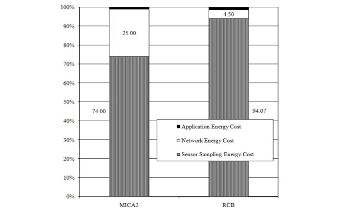 We have had several investigations to understand the energy cost of processing data from networked sensors in a smart space. We compared the cost of communication versus sensor sampling in Crossbow MICA2 and Atmel Zlink RCB (see the figure below). We found that communication cost is no longer dominant and that sensor sampling cost is the most dominant cost in information processing over sensor networks. This single experiment has led us to design continuous query algorithms based on a sound, basic cost model.